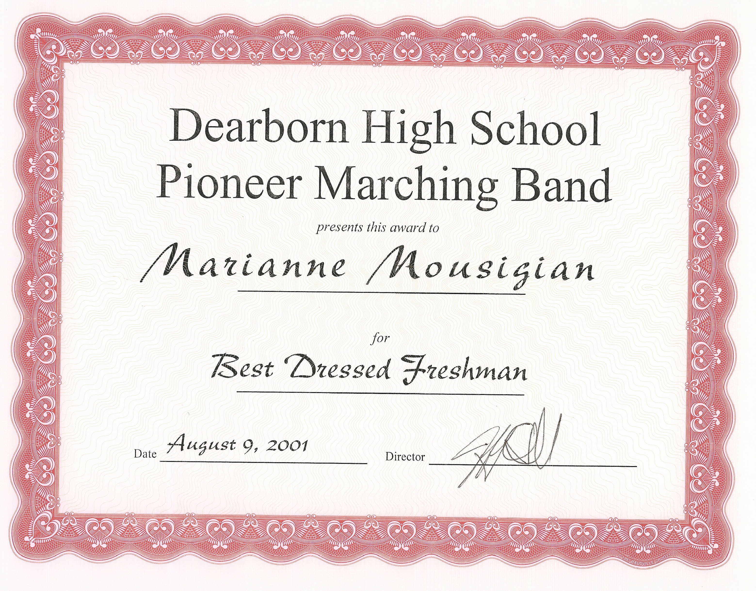 I received this award as "Best Dressed Freshman" from my peers. In order to receive it, my peers noticed and respected me. They appreciated my positive attitude and willingness to work hard. I was well-liked by the rest of the band because of my outgoing personality.