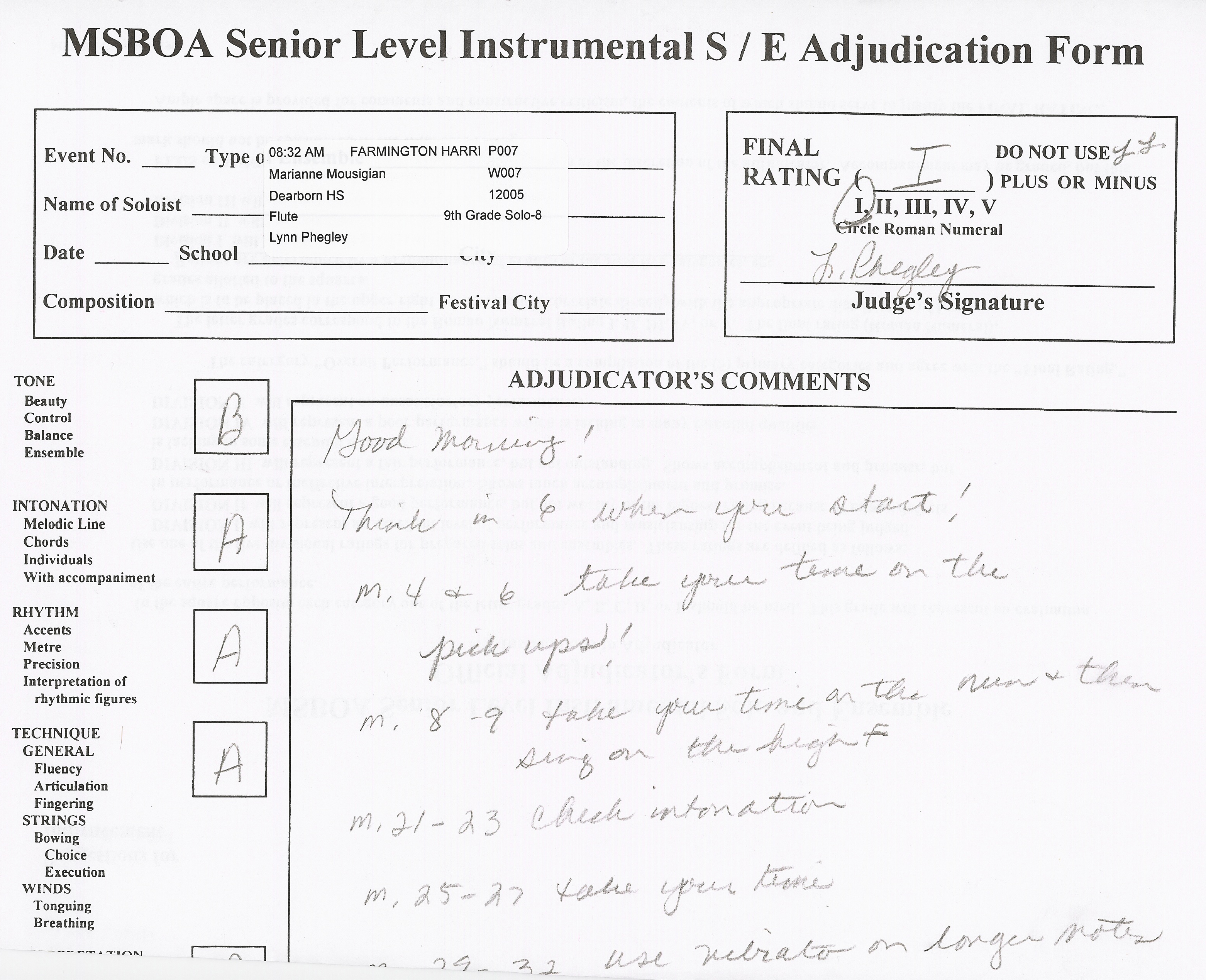 I also received a I rating at the state Solo and Ensemble Festival. In order to earn a I there, I knew I would have to improve my piece even more. I continued to practice a great deal, and ended up reaching my goal.