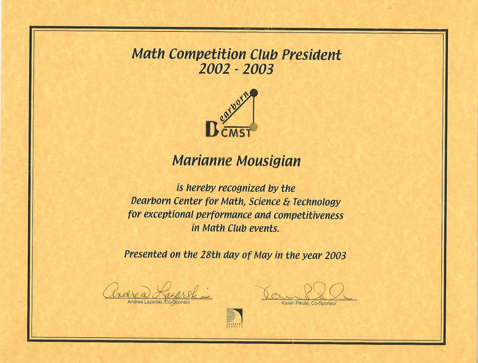 As a sophomore, I gained the support and trust necessary to hold the position of president in the Math Competition Club (MCC). I took charge to get many things done for our club and assisted with the planning. I helped run club meetings, kept track of the members' attendance, checked out dates for meetings and activities, and made flyers for our events. I also always provided my suggestions and ideas to the MCC. This position helped me to gain confidence and responsibility.