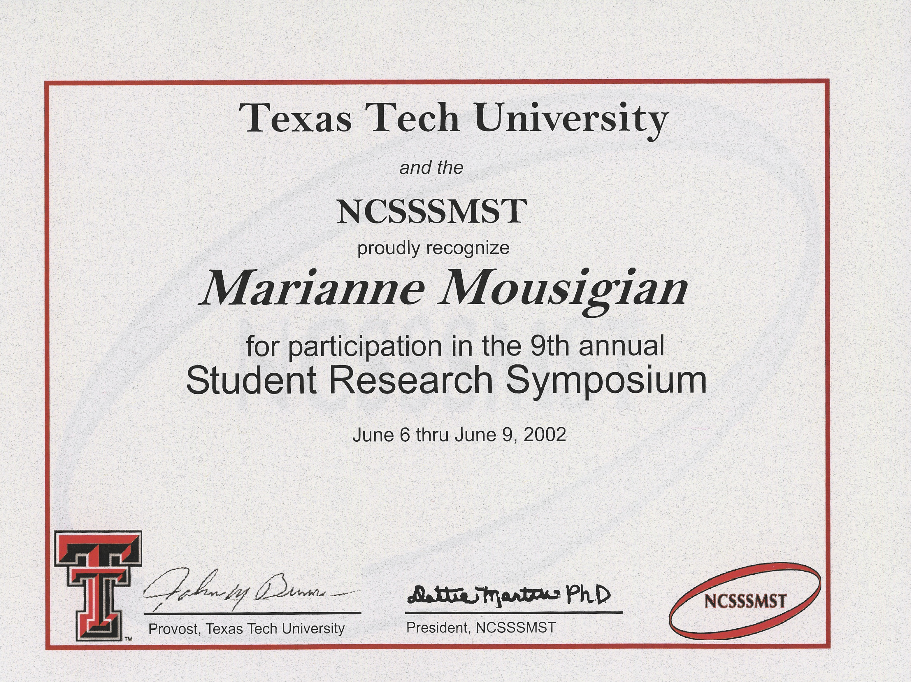 During my freshman year of high school, I was selected to attend the 9th annual NCSSSMST Student Research Symposium in Lubbock, Texas. I was fortunate enough to be one of two students whom had the opportunity to represent the Dearborn center for Math, Science, and Technology. This opportunity allowed me to see some outstanding research projects done by high school students and provided me with ideas. Also while at the conference, I was able to meet many other gifted students who attended similar types of schools to the DCMST. We were able to share thoughts, ideas, and experiences with each other. It was a wonderful experience to meet more students of such high caliber.